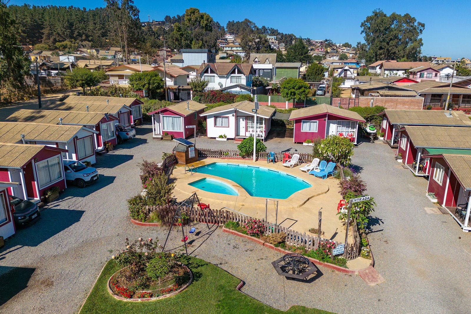 Cabañas Santa Irene es el complejo turístico con mayor capacidad del balneario. Cuenta con complejos ubicados junto al bosque y frente al mar. Su recinto junto al bosque, está a sólo pasos del centro y playas de Pichilemu, donde ofrece cabañas para 2 hasta 5 personas completamente equipadas, que incluyen acceso a su piscina, wi-fi, sala de juegos con mesa de pool, taca-taca y opciones para toda la familia. En temporada alta, reservas 3 noches mínimo.